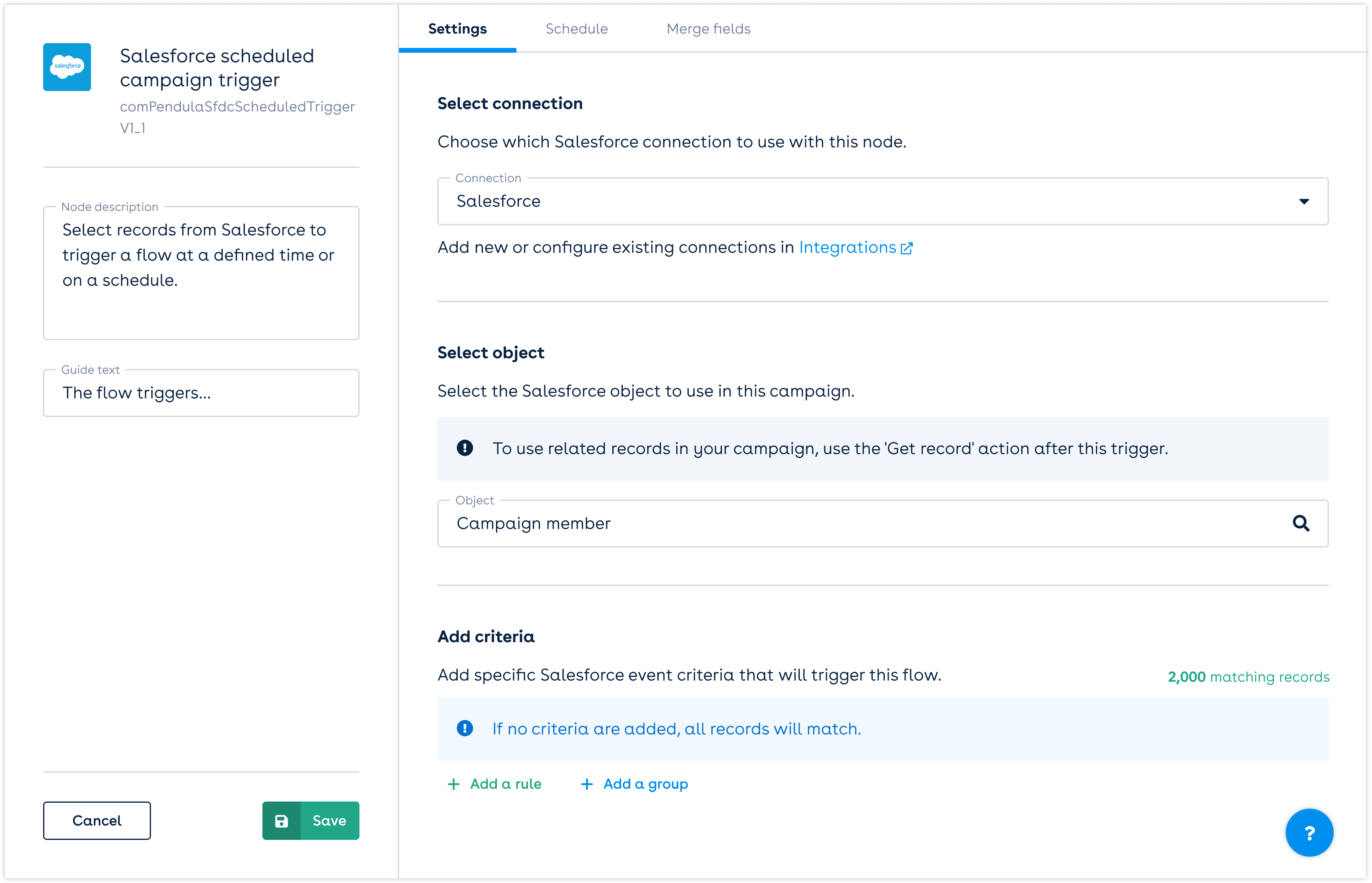 The ‘record count’ above the criteria builder shows you how many records match the criteria you have selected. If you do not add any rules to your contact filters, the flow will send to ALL records based on the selected object.