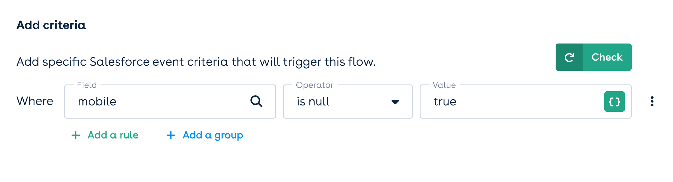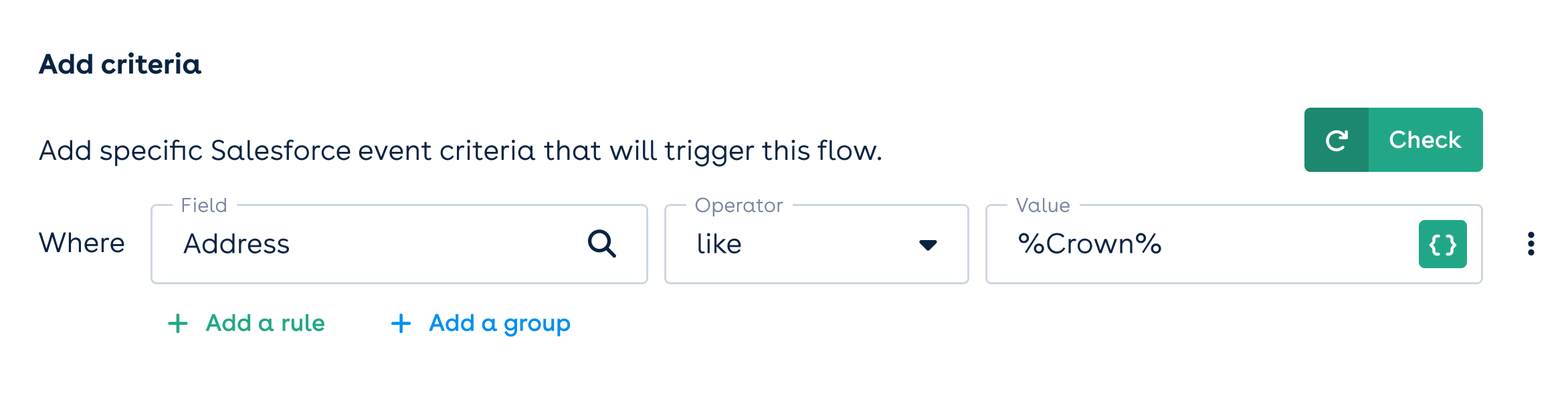 The Add criteria section allows you to specify your flow criteria by referencing fields that coincide with any objects that share a one-to-one relationship with the object you have selected for your triggering object. To set a rule, search for (or browse) and select the relevant field name from the Field dropdown.