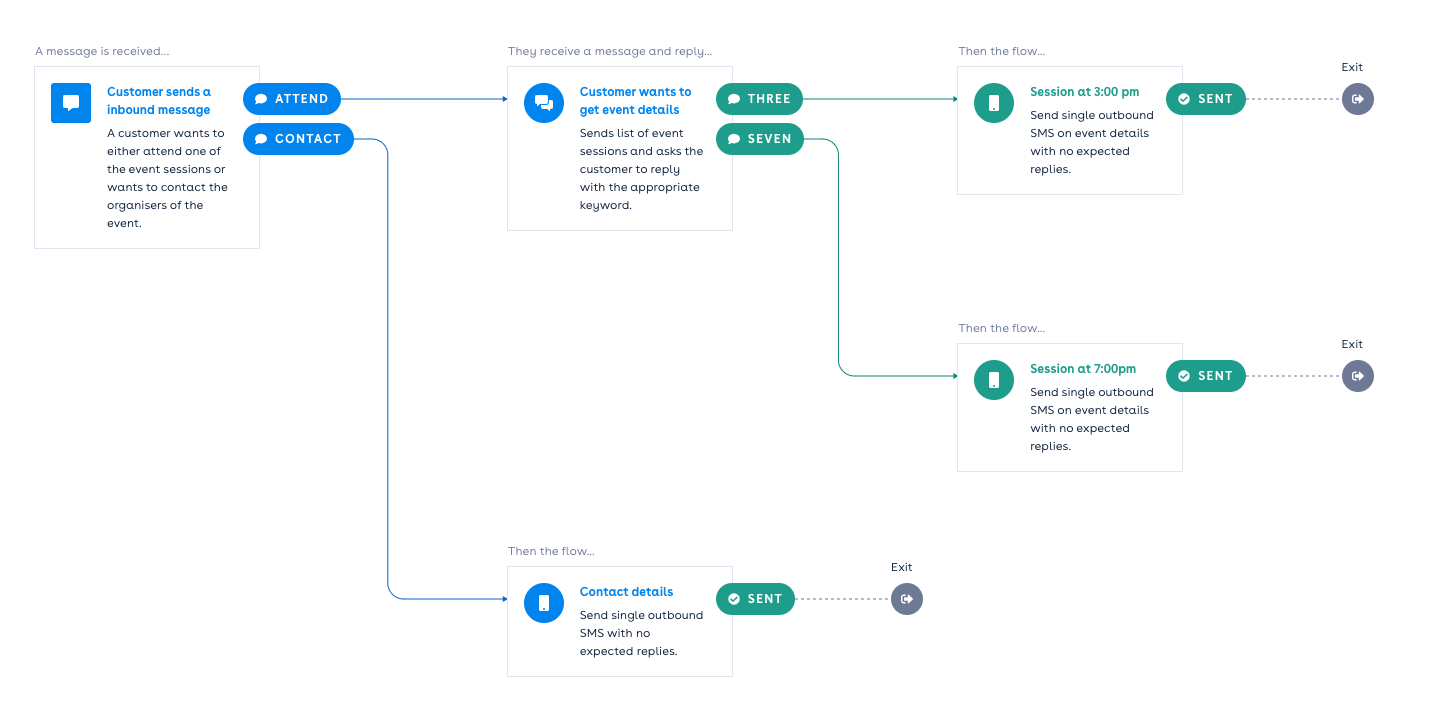 The example below demonstrates the use of the Inbound Trigger Node within a flow that initiates an experience when a customer expresses interest in an event. By replying with ATTEND, the customer indicates their intention to attend the event, while replying with CONTACT signifies an interest to get in touch with the organisers. The Inbound Message Trigger node evaluates the different replies and appropriately routes the flow to handle each specific request.