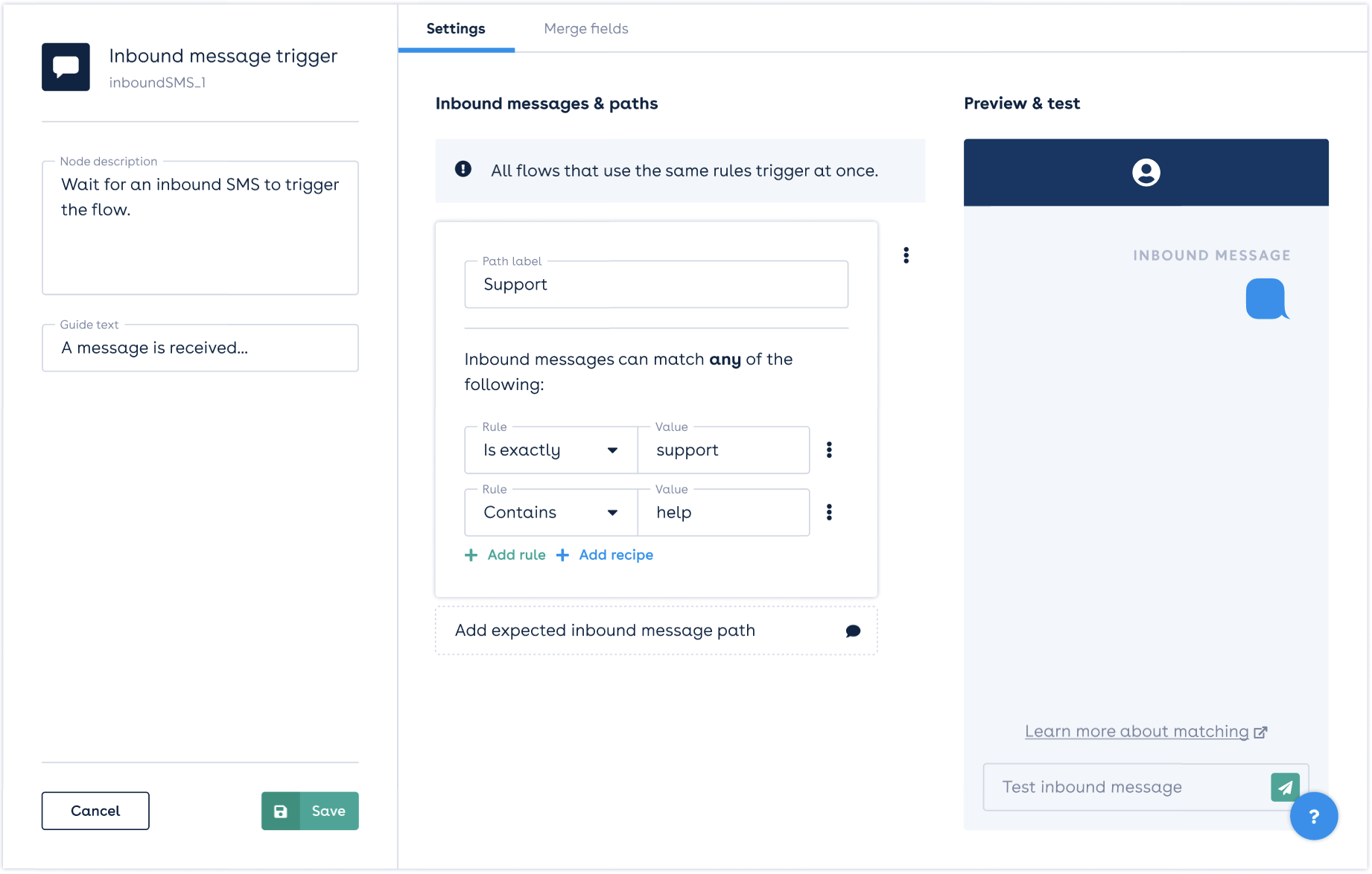 The Inbound Message Trigger starts a flow in response to incoming messages that meet specific criteria. When a message is received, a systematic prioritising exact keywords before considering broader rules.