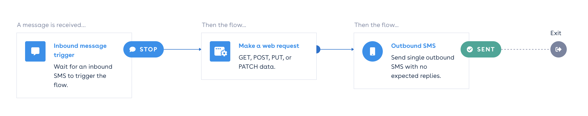 Classifies the kind of rule match that prompted the flow to activate. This can be used in later nodes such as Criteria Filter. | Exact Match (Trigger) | An inbound message has been matched to the is exactly rule in an Inbound SMS Trigger Node. |