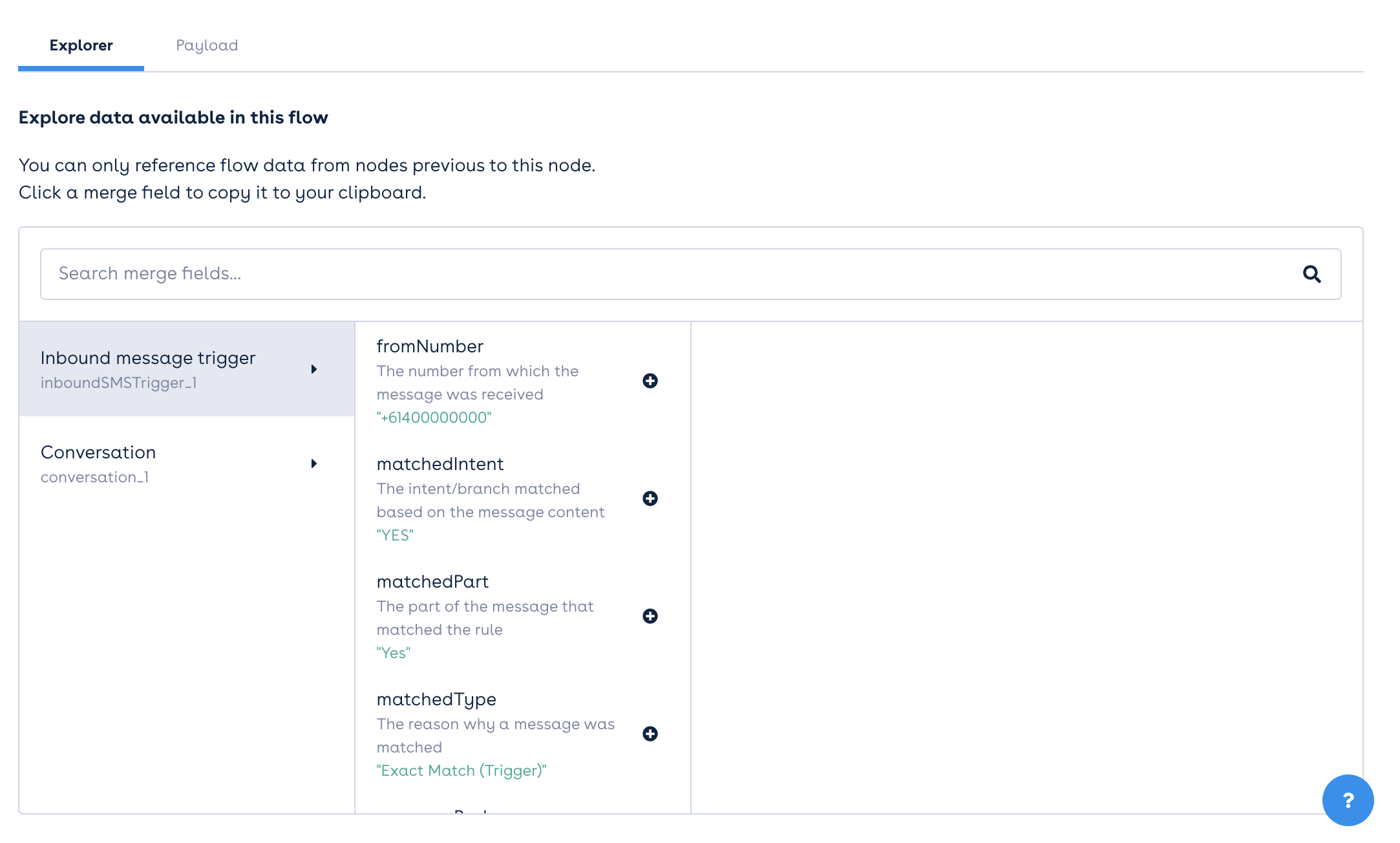 Mergefields function as dynamic placeholders within a flow, automatically populated with actual data as the flow progresses. Below are key mergefields accessible in subsequent nodes following the Inbound Message Trigger