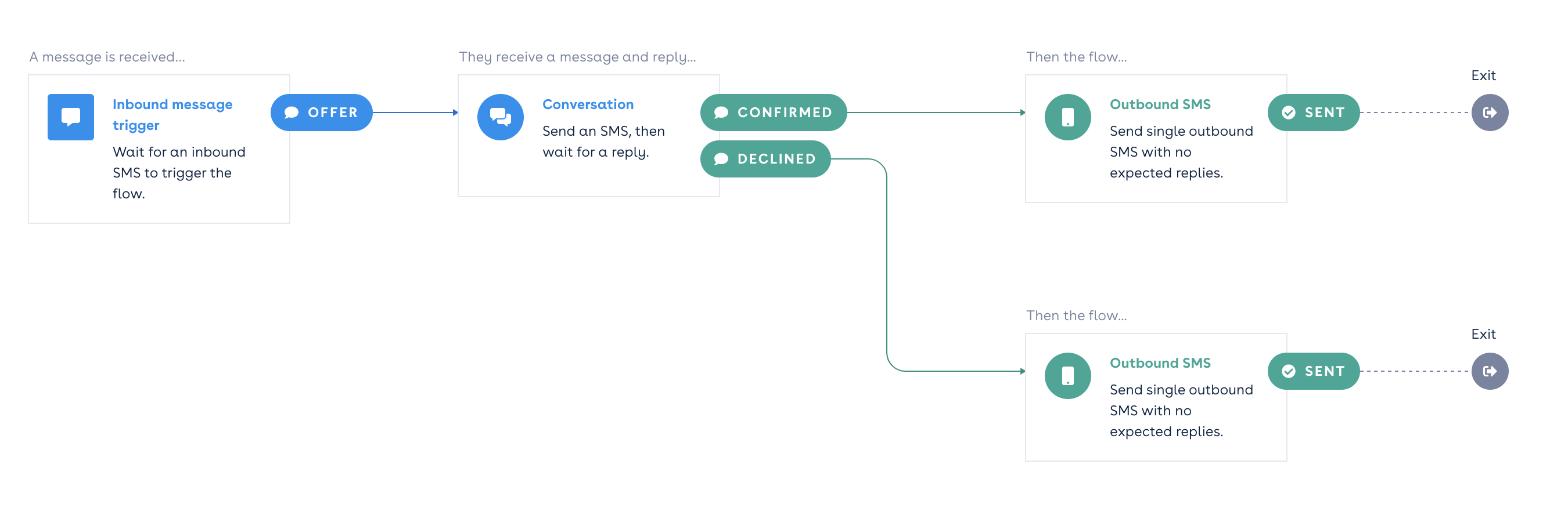 OFFERis used. The flow prompts the customer to eitherCONFIRMorDECLINEthe offer and based on the reply, sends outbound SMS.