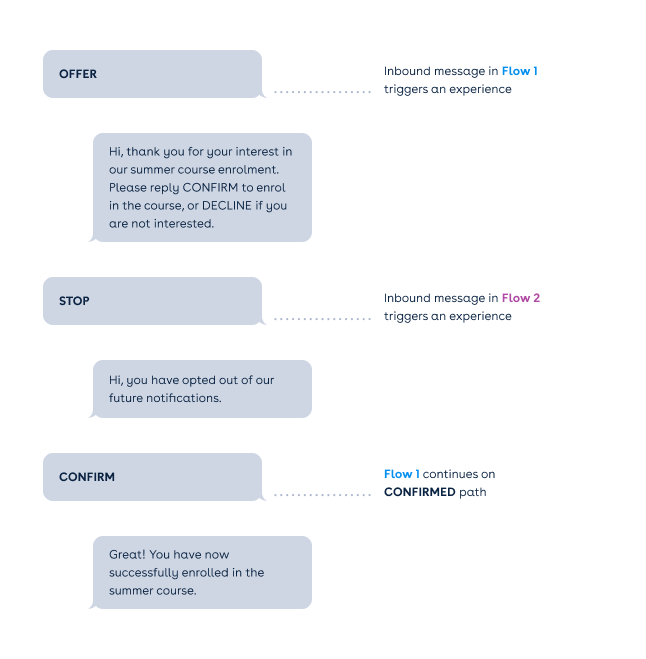 Here is an example conversation where the person messages 'STOP' (as an opt-out) and then messages 'CONFIRM' in response to the original offer, the flow will continue on the 'CONFIRMED' path.