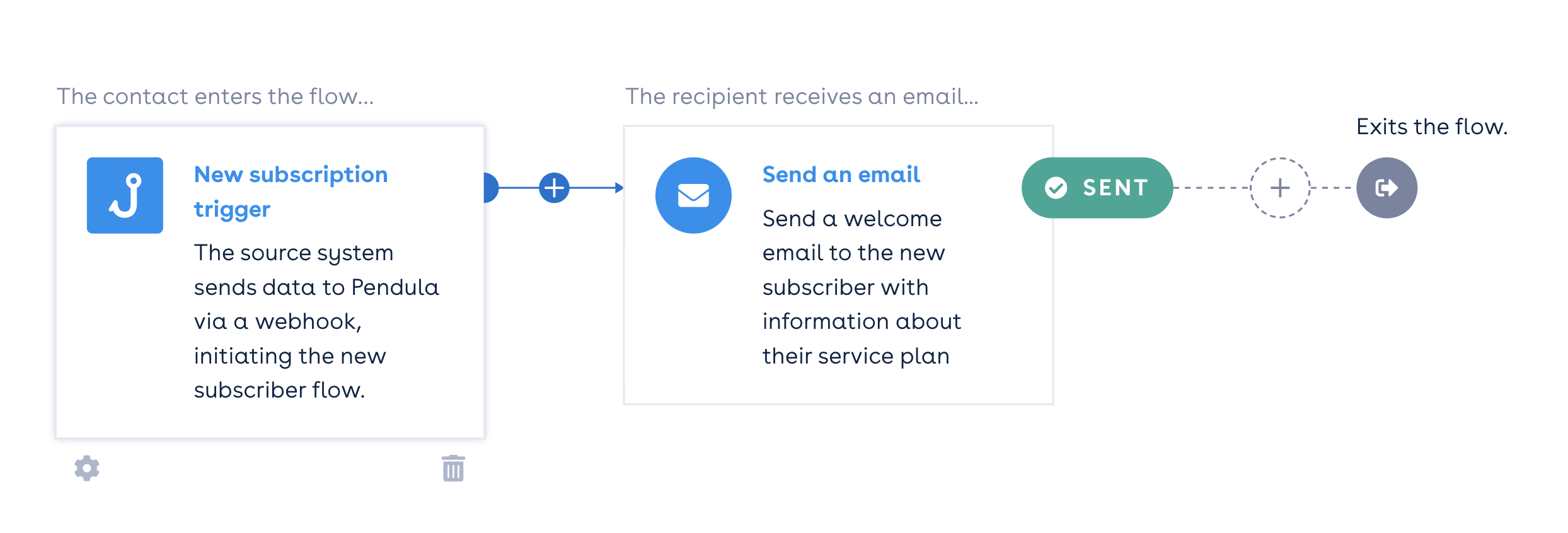 The following example demonstrates a practical application of the Webhook Trigger within a flow, that sends an onboarding message following a new service subscription. When a user signs up for a new subscription, the source system is configured to send a payload to a webhook URL. Here is an example request body of a payload: