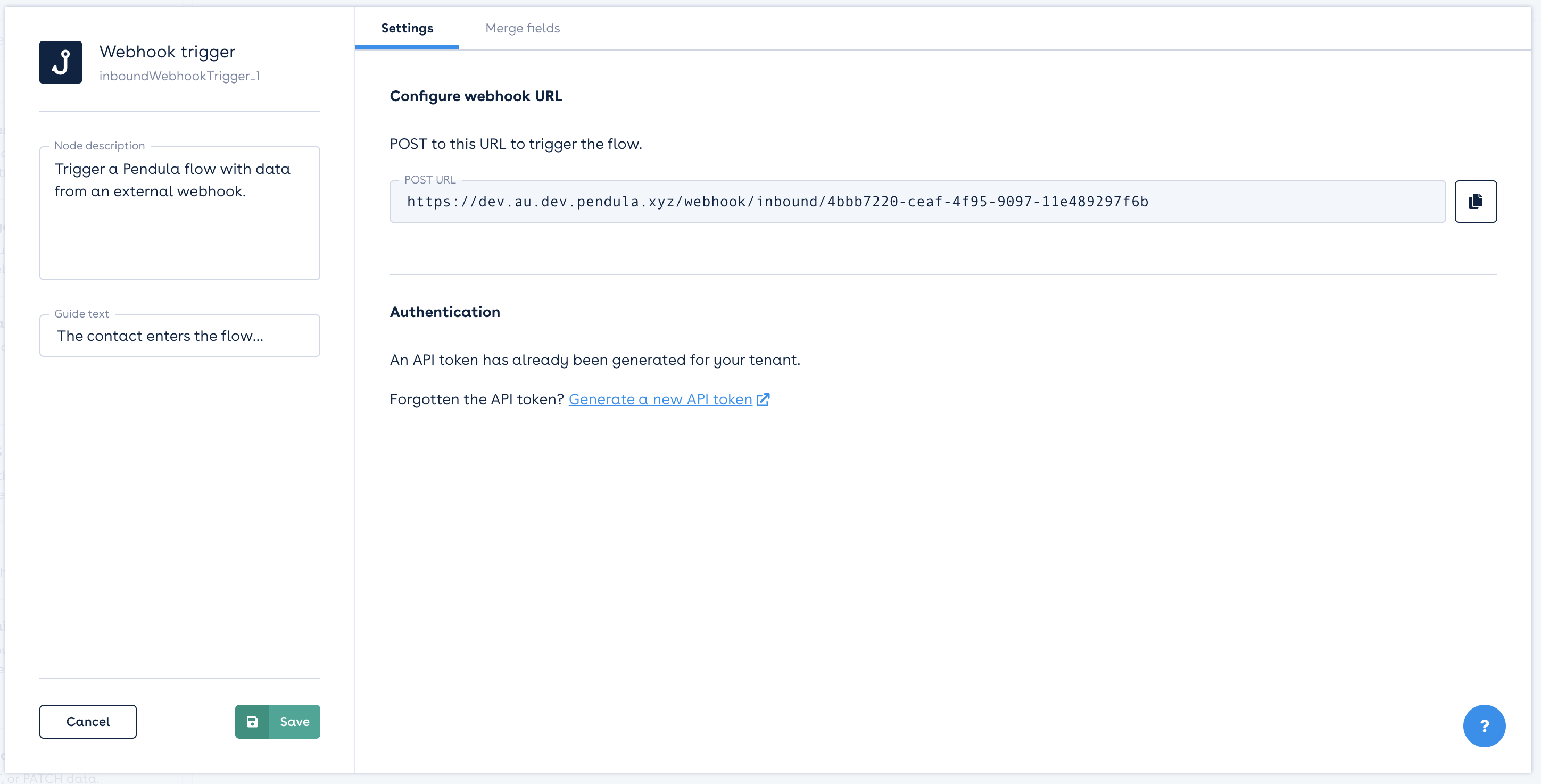 - In a new flow, drag and drop the webhook trigger node onto the canvas to open up the settings panel.