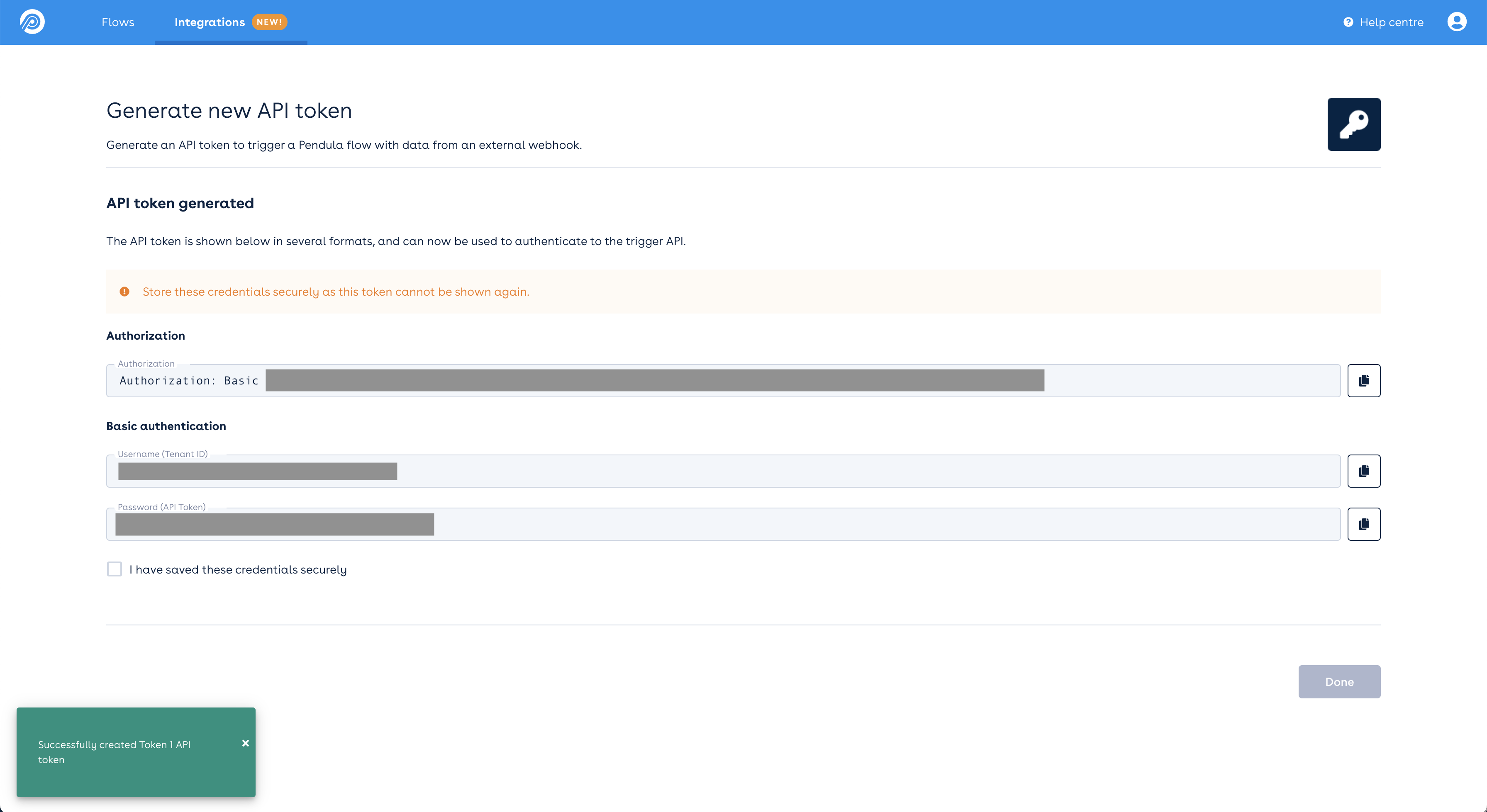 - Ensure the credentials are saved securely, check the I have saved these credentials securely checkbox, and select Done. Now you can use this API Token to authenticate inbound payloads to the webhook trigger in the Flow builder.