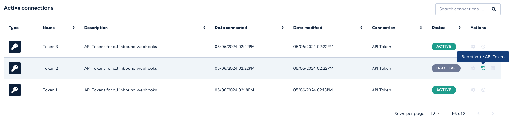 - In the Integrations page, locate the 'Inactive' API token you wish to reactivate.