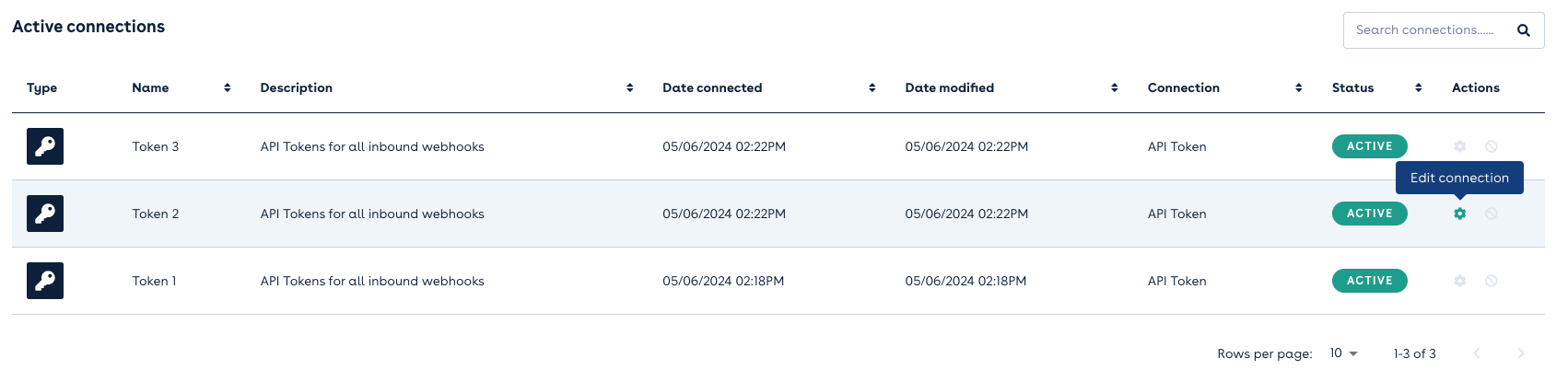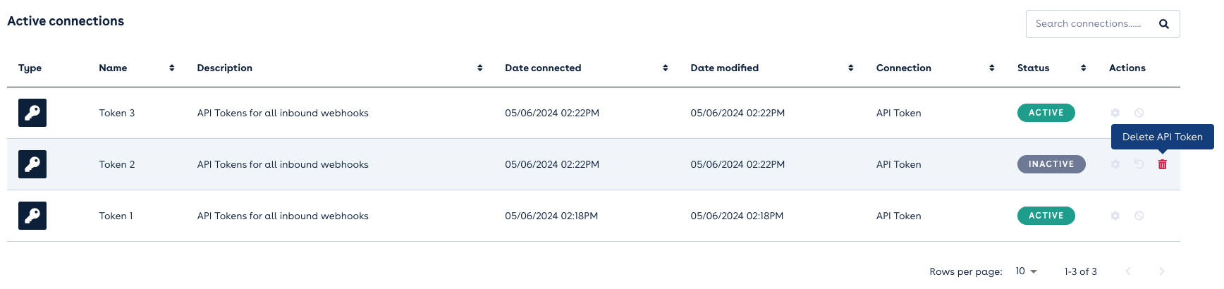 - In Integrations, under Connections, locate the 'Active' API token you wish to deactivate.