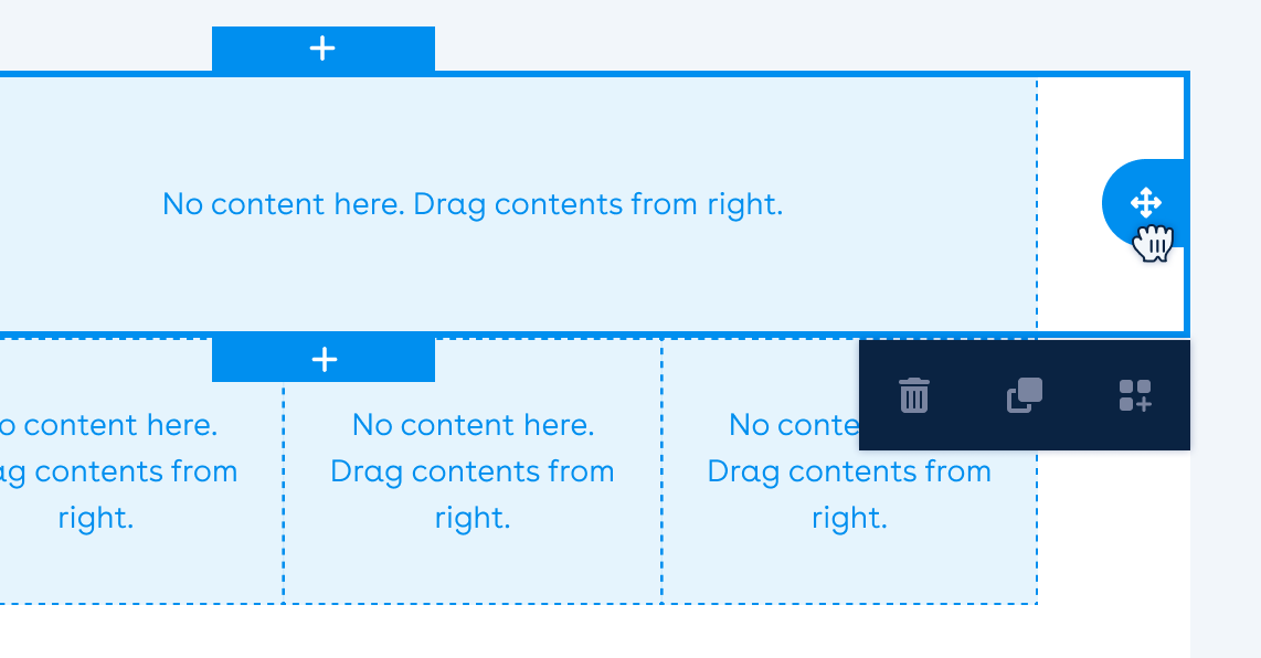 To move content or a row, hover over the item to reveal the pan icon. Click and drag the item to its new desired location.