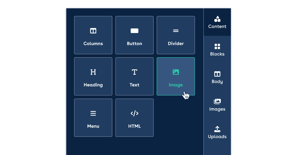Content allows the addition of columns, HTML, and other visual elements such as text, buttons, dividers, and images. Here’s how you can add and customise content in your email: