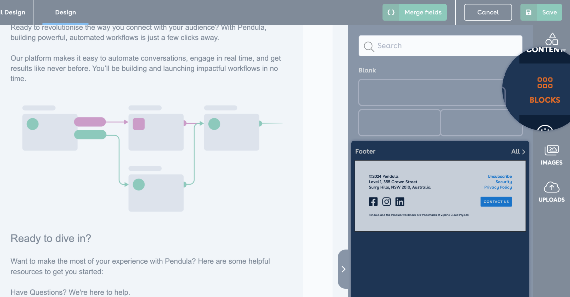 Blocks allows the addition of pre-made columns or rows, enabling you to structure your email layout efficiently. Here’s how you can use and customise blocks: