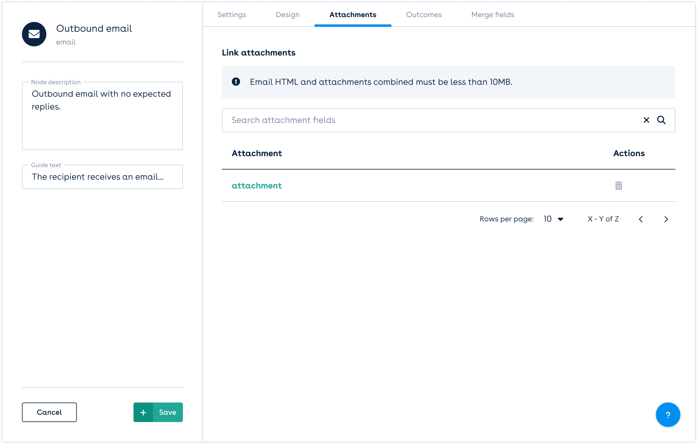 The outbound email node sends an outbound email with attachments to recipients. Attachments used with this node require an integration.
