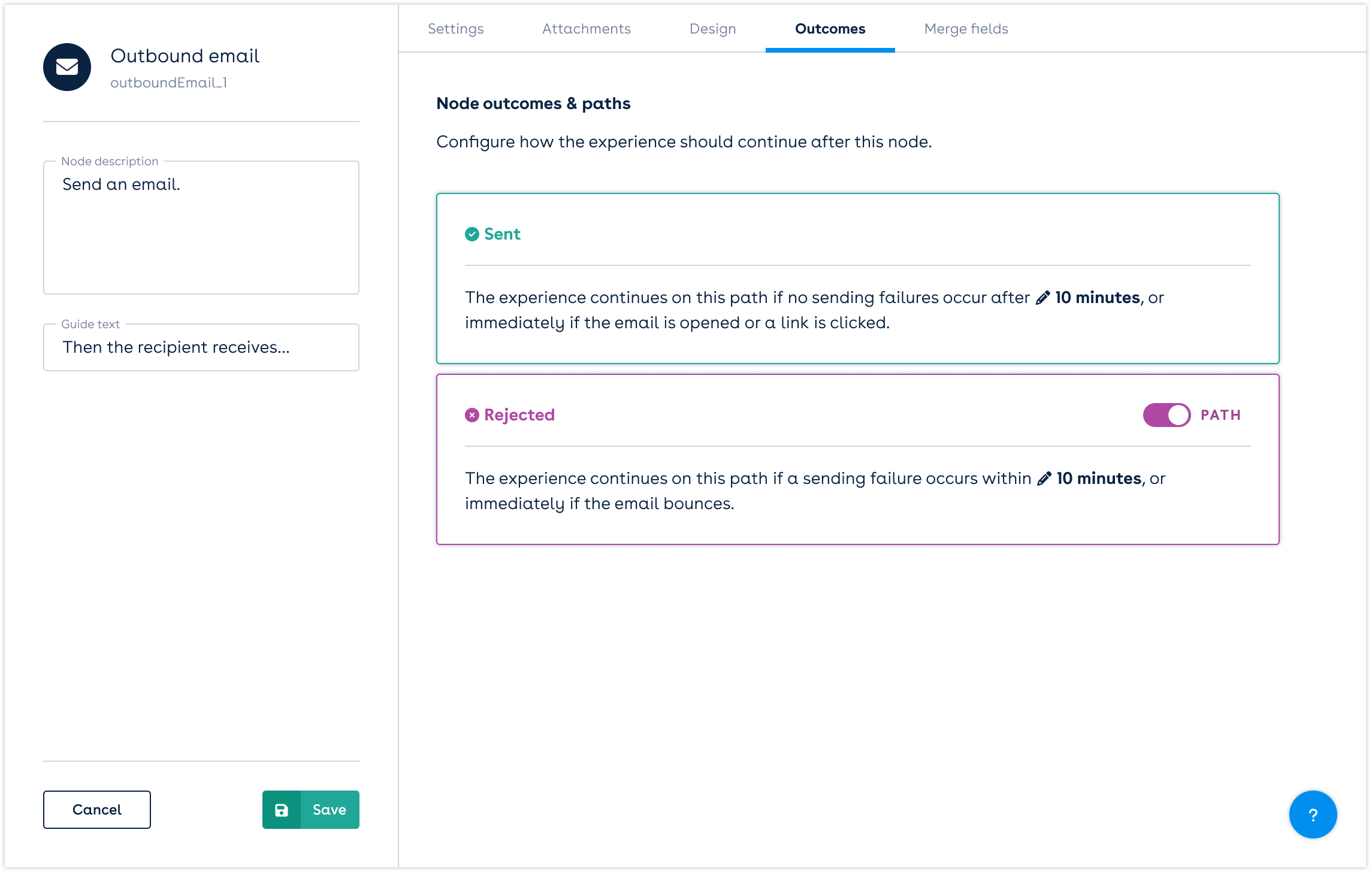 When toggled off, the experience will end and exit the flow. When toggled on, the Rejected path will be visible on the canvas, where you can further configure the experience on this path. You can refer to Merge fields section below to personalise experiences continuing on this path.
