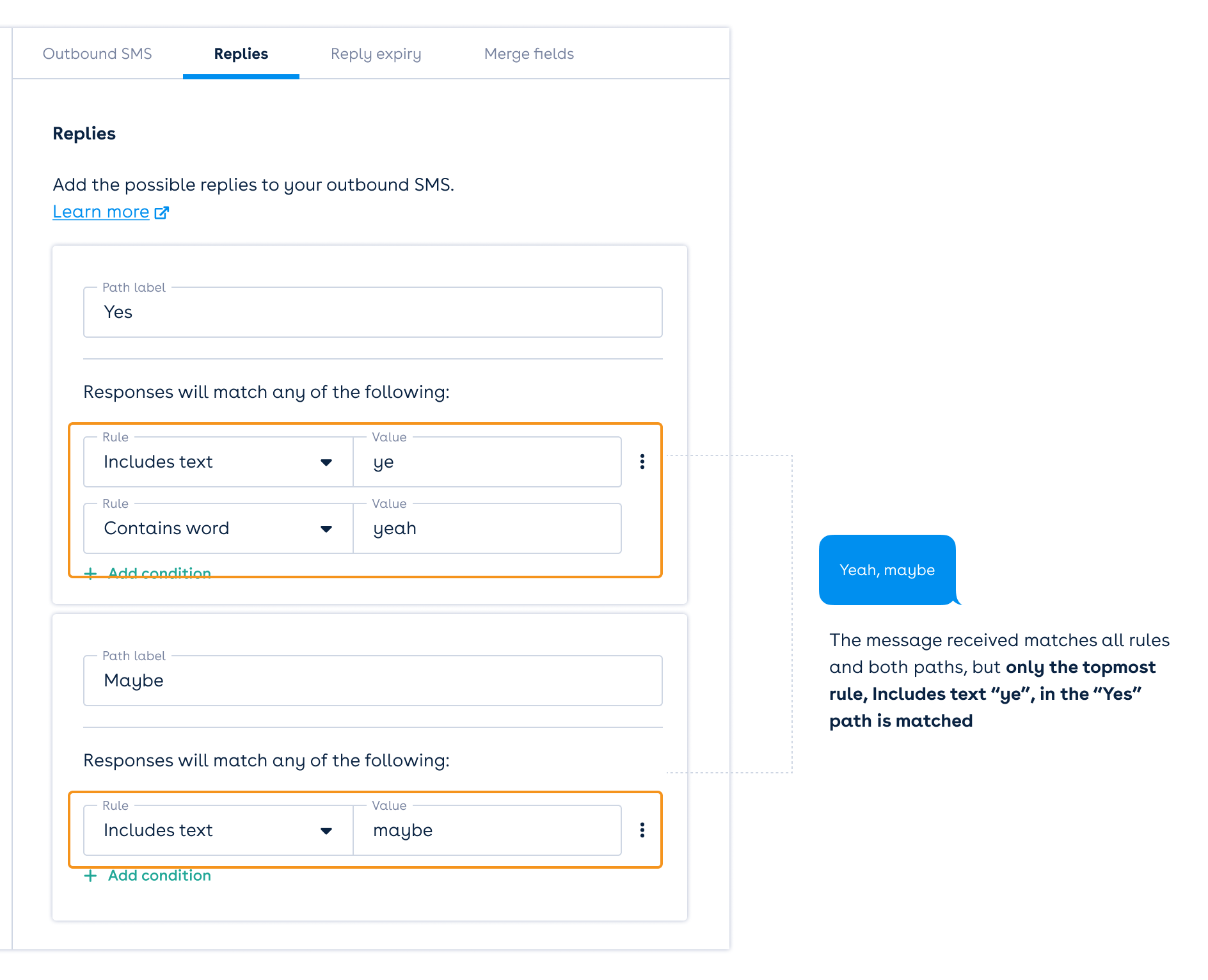 When a message matches any rule or recipe in a path, it will follow that path. The relationship between each rule and recipe is "OR," meaning that if a reply matches at least one of the rules, it will be matched to that path.