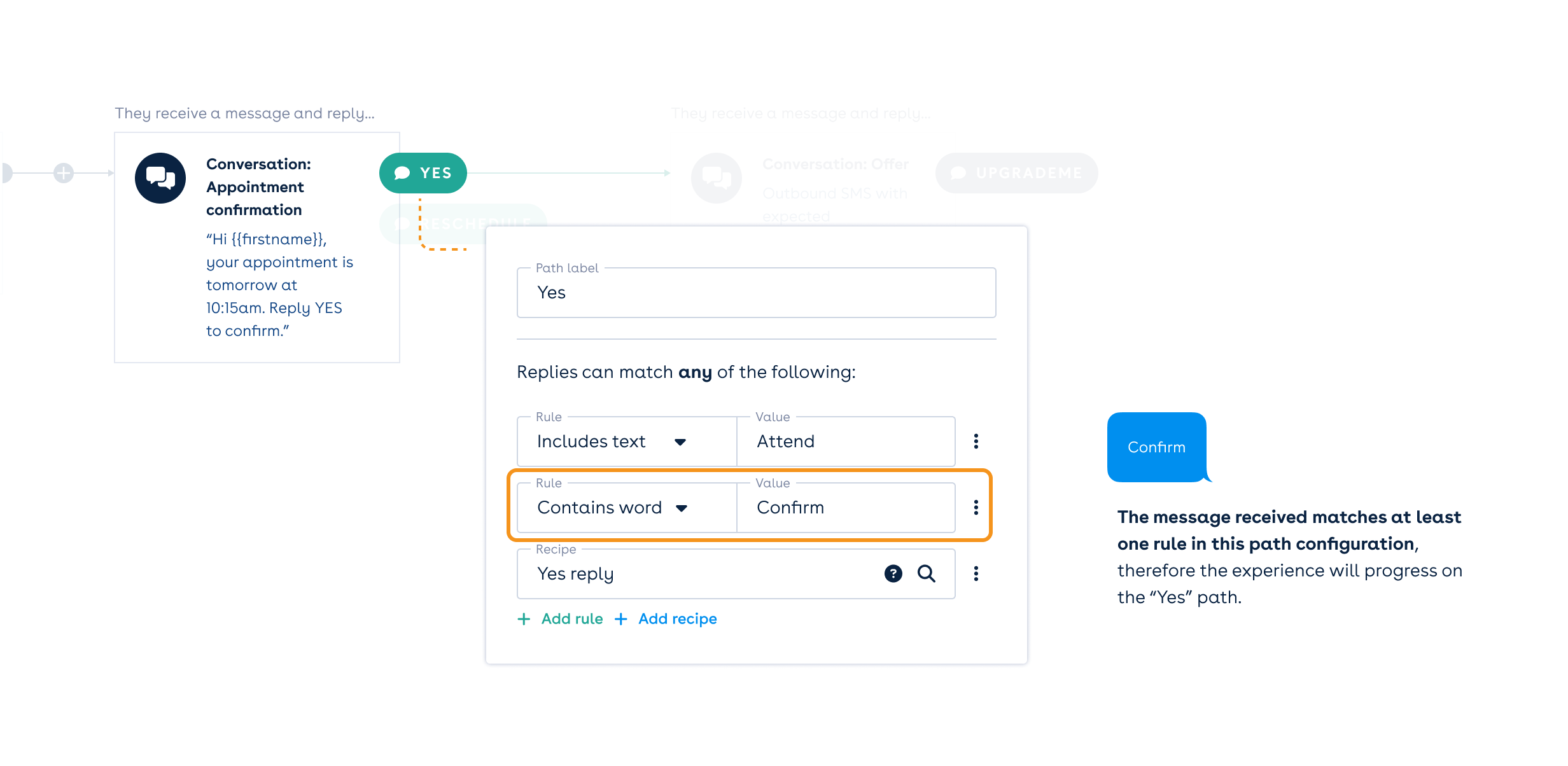 - If a reply matches rules across different active experiences, the reply will be matched to the customer's most recent conversation. Consider Annie, who is in two marketing flows that both listen for the keyword UPGRADE. The first offer is sent at 8 am, and the second at 9 am. When she replies with UPGRADE, her reply is matched to the second flow since it is the most recent interaction.